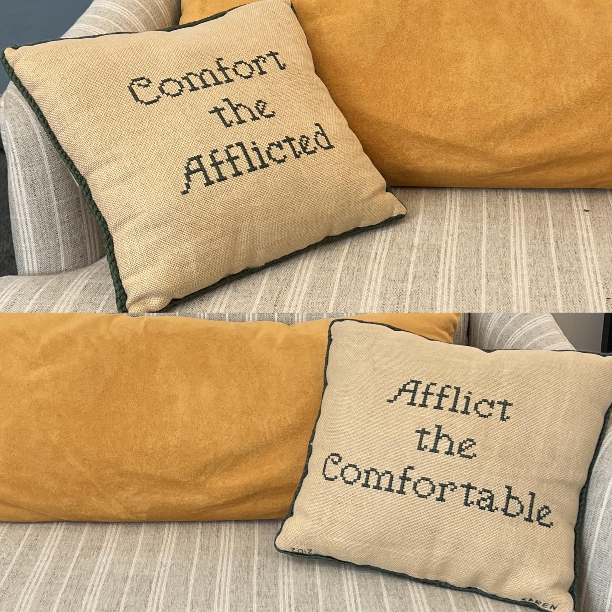5.) Intellectual discomfort is avoided, not designed. While trying to make our campuses a “safe space for all,” we may be missing the chance to allow, even invite, discomfort as we consider issues from other points of view. I gave my husband this two-sided pillow for his office as a pastor, and it is just as important as those of us who educate.