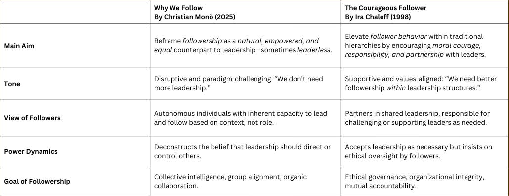 While I’d love to have you dig in deeper and read Monö’s book, maybe even go back in time and read Chaleff’s, my assistant and I crafted this table to compare the two books’ contribution.